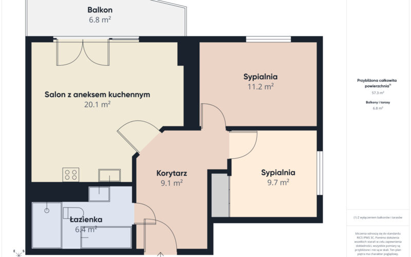 Samo mieszkanie ma powierzchnię 57,29 m² i znajduje się na drugim piętrze budynku zarządzanego przez wspólnotę mieszkaniową. Usytuowanie na tej kondygnacji zapewnia poczucie prywatności, ciszę oraz przyjemny widok na zieleń. Dużym atutem jest przestronny balkon o powierzchni około 8,5 m², który stanowi naturalne przedłużenie strefy dziennej i idealne miejsce do wypoczynku.
