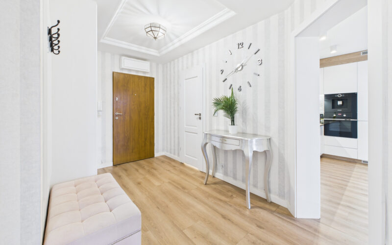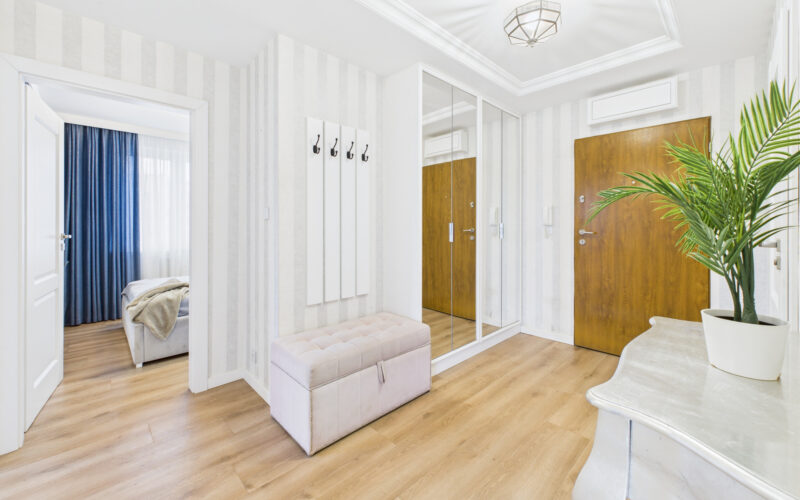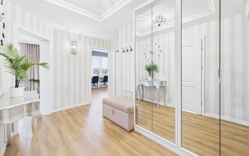 - Przedpokój oferuje dużą ilość miejsca do przechowywania dzięki zabudowanej szafie.