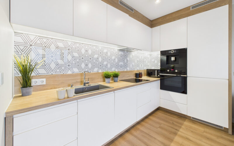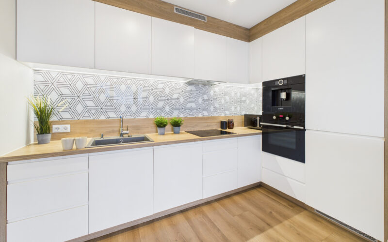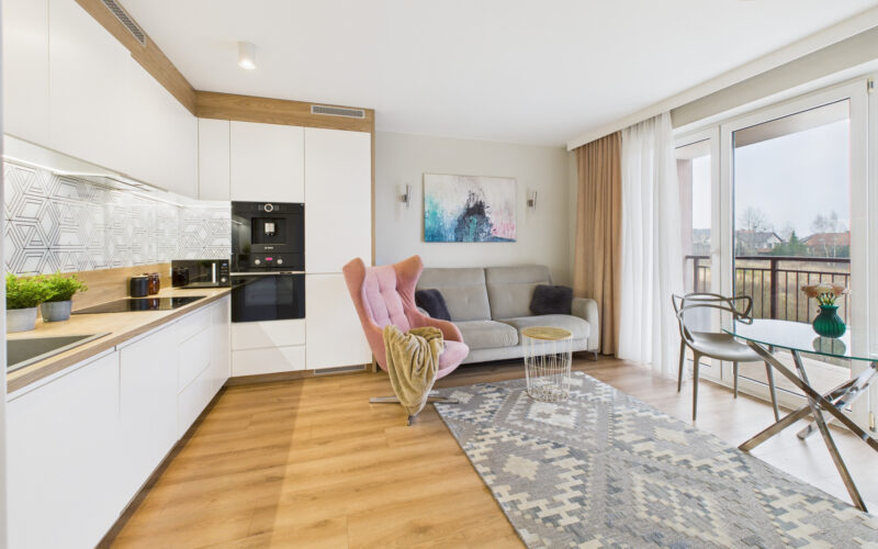 - Centralnym punktem mieszkania jest jasny salon połączony z aneksem kuchennym, wyposażonym w wysokiej klasy sprzęt AGD, w tym zmywarkę, piekarnik, płytę indukcyjną, lodówko-zamrażarkę oraz wbudowany ekspres do kawy. Strefa dzienna jest przestronna, dobrze doświetlona i posiada bezpośrednie wyjście na balkon.