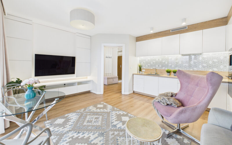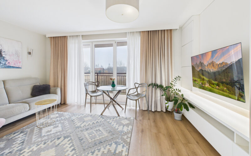 Mieszkanie zostało urządzone w nowoczesnym stylu, z dbałością o detale i spójność estetyczną. Sprzedawane jest z pełnym wyposażeniem RTV i AGD, co oznacza możliwość wprowadzenia się bez ponoszenia dodatkowych kosztów. Do lokalu przynależy piwnica, a na terenie ogrodzonego osiedla dostępne są miejsca parkingowe dla mieszkańców.