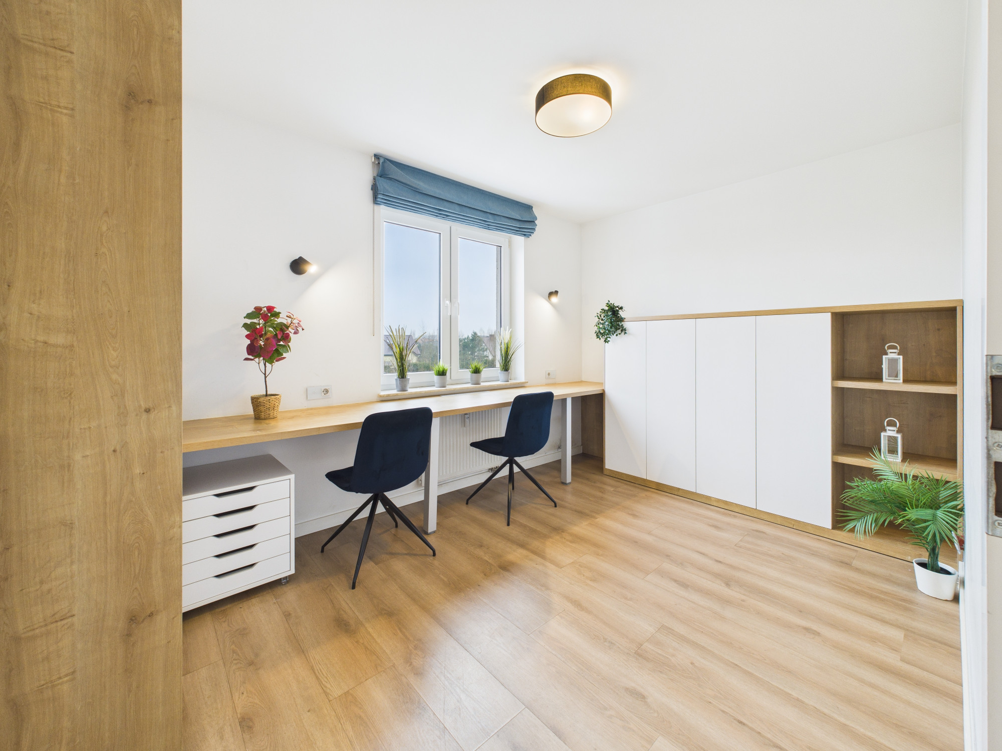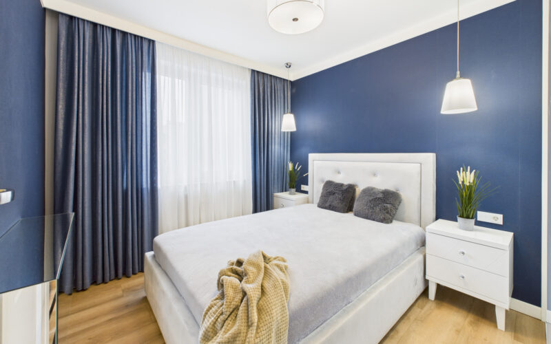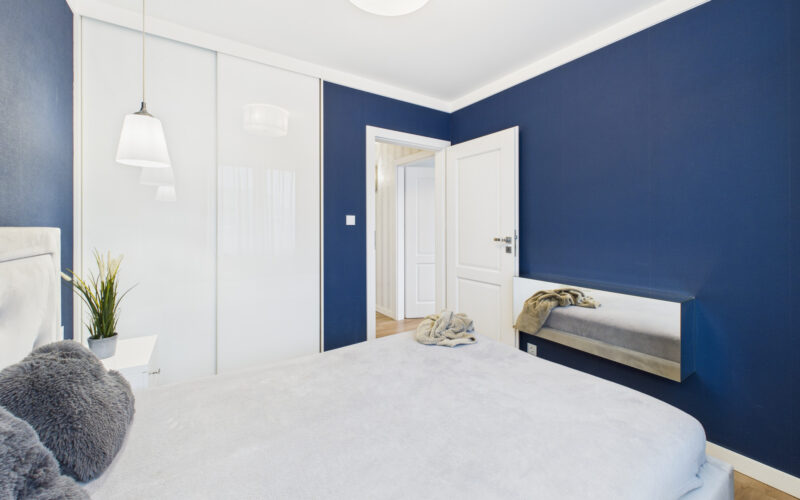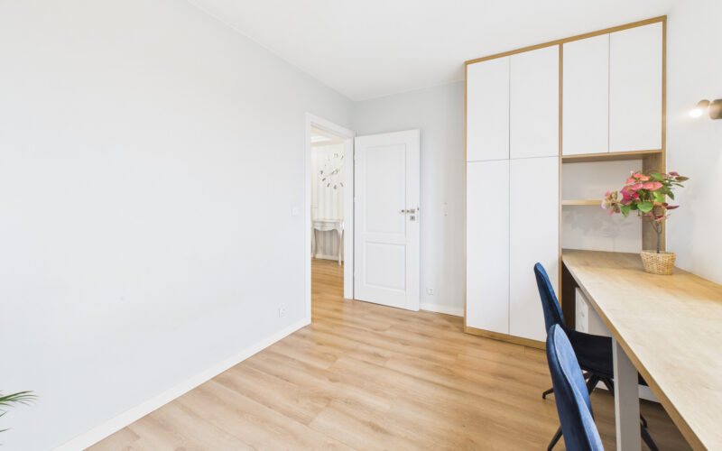 - Dwie oddzielne sypialnie dają wiele możliwości aranżacyjnych – jedna z nich pełni funkcję głównej sypialni z łóżkiem małżeńskim i pojemną zabudową szaf, druga doskonale sprawdzi się jako pokój dziecięcy, gabinet do pracy zdalnej lub pokój gościnny.