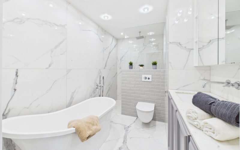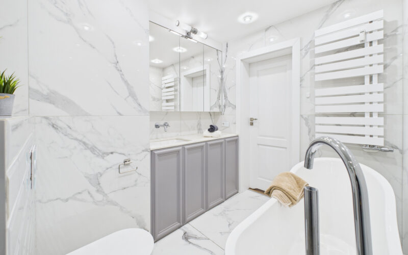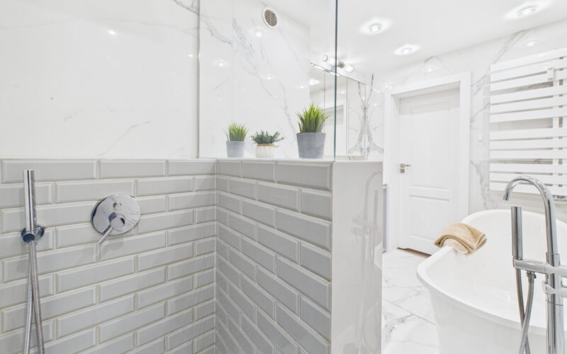 - Łazienka została wyposażona zarówno w wannę wolnostojącą, jak i prysznic, a jej układ zapewnia wygodę codziennego użytkowania.